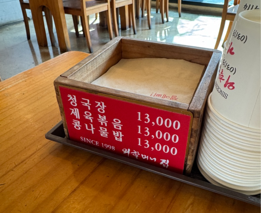 메뉴는 청국장, 제육볶음, 콩나물밥 3가지입니다. 맛집들은 보통 메뉴가 몇 개 없는 것 같습니다. 3가지 메뉴에 집중하시는걸까요? 제육볶음과 청국장 2개를 주문했습니다.